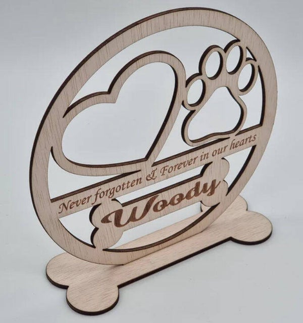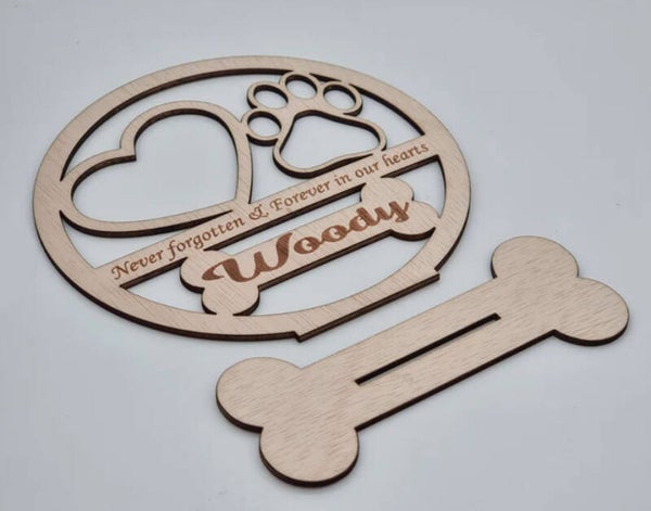 De staander heeft de vorm van een bot en in de cirkel is de tekst "never forgotten & forever in our hearts" gegraveerd.