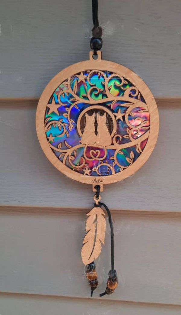 Niet één, maar twee katten uit de boom kijken. Daar ben je wel even mee bezig. Maar als je toch kijkt, neem dan meteen de tijd om eens rustig naar het kleurenspel te kijken wat omtstaat wanneer de zon op deze suncatcher schijnt.