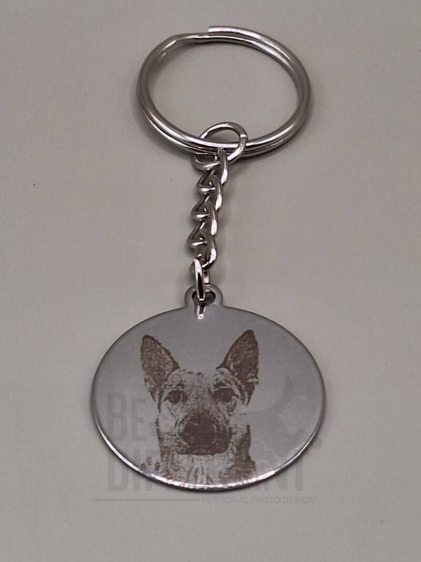 De sleutelhanger kan ook als dogtag worden gebruikt en is gemaakt van rvs